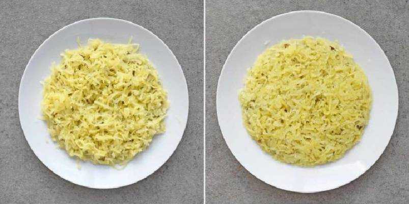 Картофель моют, кладут в небольшую емкость с водой и варят 15 минут. Остужают, снимают кожуру, измельчают на терке.