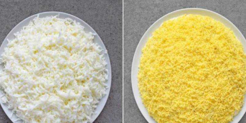 - Яйца отварить, после чего погрузить в холодную воду, когда остынут – очистить от скорлупы, разделить на желтки и белки, натереть на терке в разные тарелки.