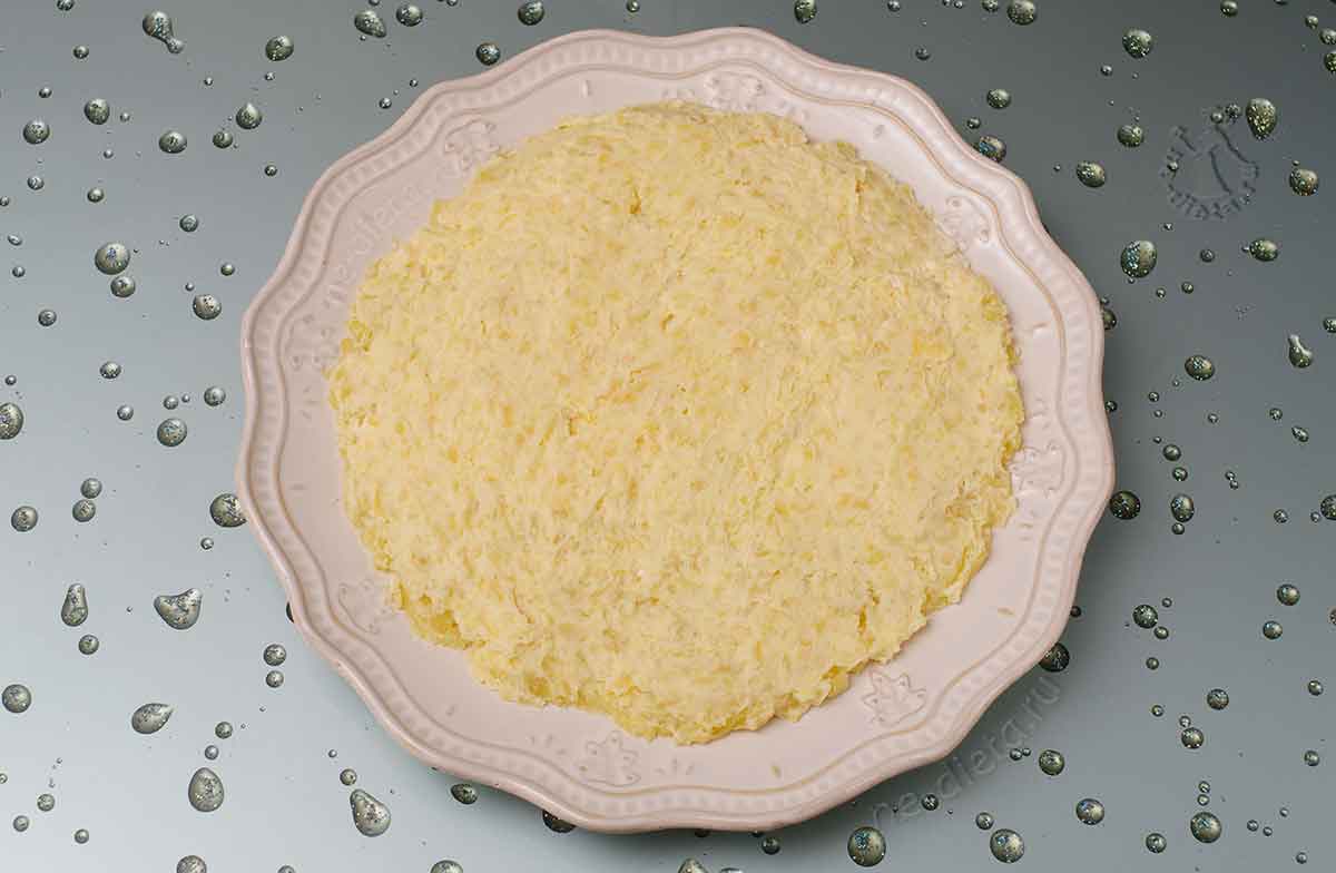 5. Теперь можно начинать выкладывать салат «Мимоза» по слоям в глубокой форме размером примерно 20 х 20 см или на блюде диаметром около 24 см. Первым слоем будет идти отварная картошка, которую надо посолить и хорошо промазать майонезом, чтобы она не была суховатой.