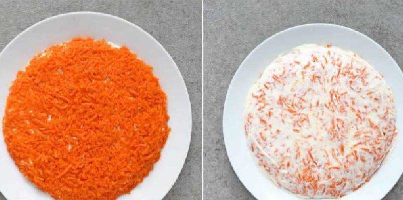 - Вареную морковь также перетереть, уложить следующим слоем, внести приправы и смазать.