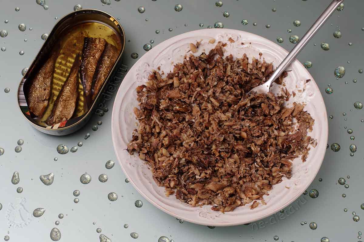 4. Шпроты вынуть из масляной заливки и слегка промокнуть бумажным полотенцем, после чего положить их в мисочку и как следует размять вилкой вместе с костями и хвостами, чтобы получилась рыбная крошка. Как альтернатива, маленьких рыбок можно мелко порубить ножом, но лично мне удобнее первый способ обработки.