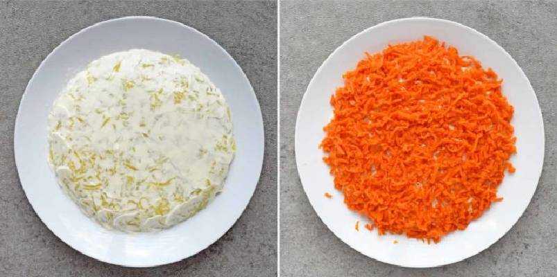 8. Далее положить натертую морковь, слегка посолить ее и смазать майонезом.