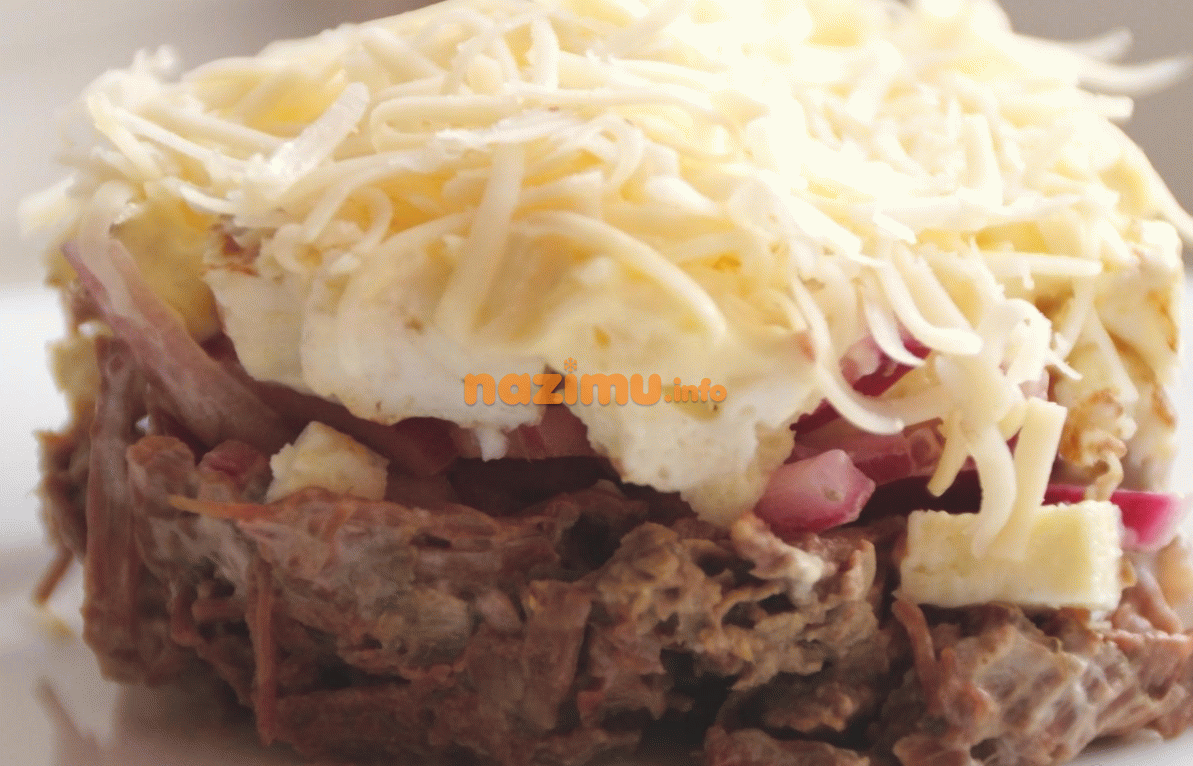 4. Все ингредиенты подготовлены можно приступать к сборке салата. Первый слоем будет резаная говядина. Затем выкладываем маринованный лук. Почему поверх мяса? Потому как говядина отлично сочетается с маринованными овощами. Теперь кладём тонким слоем картофель. Промазываем майонезом, кладём тертое яйцо, снова майонез и посыпаем сыром. Не прижимайте его сделайте массу более воздушной.