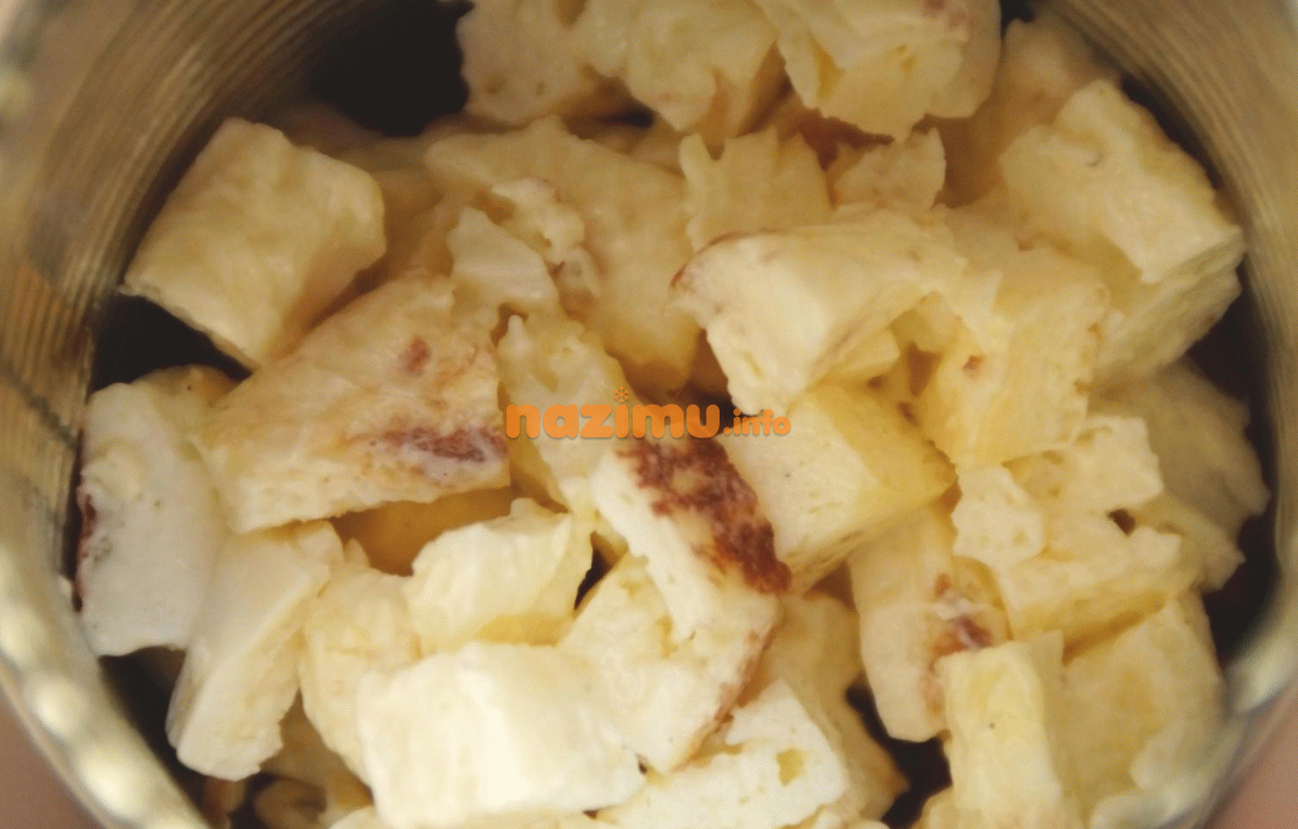 - Курицу, лук, зелень, ананасы мелко нарезают.