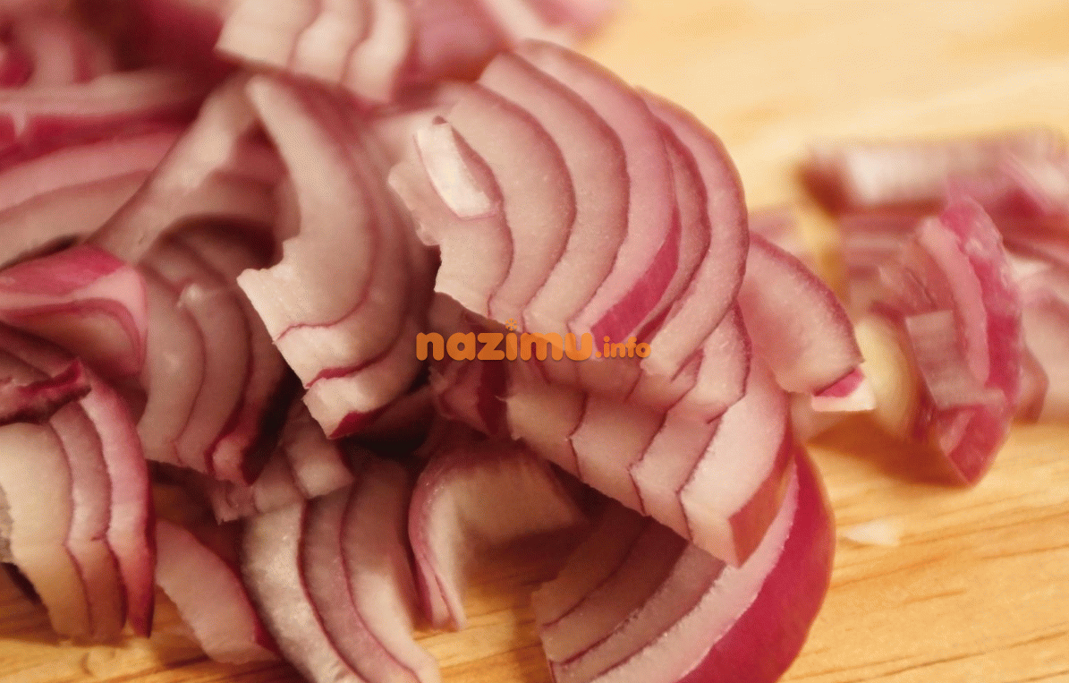 - Лук ошпаривают кипятком, чтобы убрать горечь.