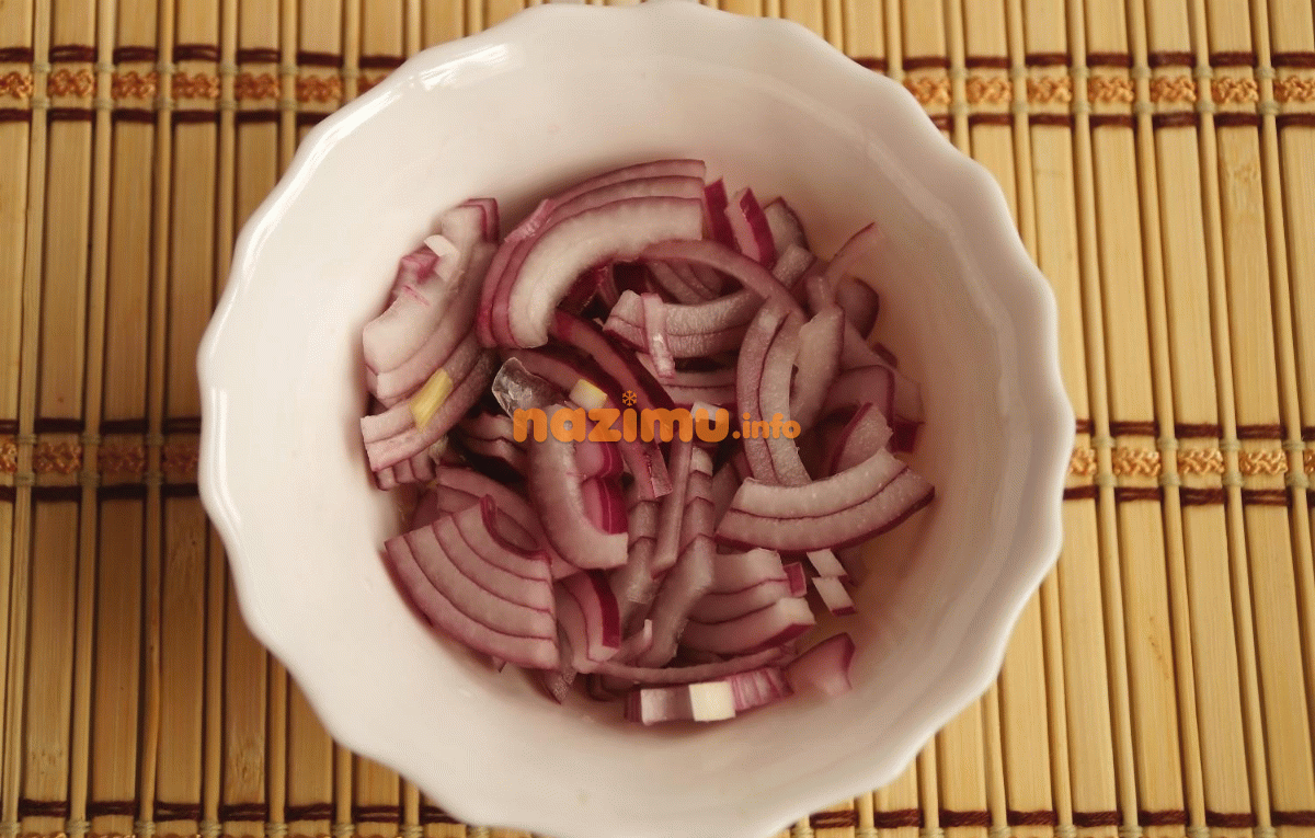 Перед приготовлением салата вам следует приготовить лук, ведь в это блюдо требуется именно маринованный лук. Лук нарежьте соломкой или полукольцами, обдайте кипятком, всыпьте соль и сахар, налейте на глаз уксус (несколько ст.л.). Маринуйте полчаса и потом слейте лишнюю жидкость.