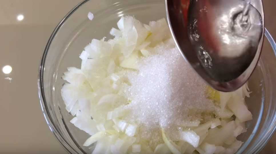 Маринуем лук. Нарезаем как можно мельче. Складываем в миску. Добавляем десертную ложку сахарного песка, две десертные ложки яблочного уксуса, заливаем 50 мл. теплой воды. Перемешиваем. Отставляем на некоторое время для маринования.