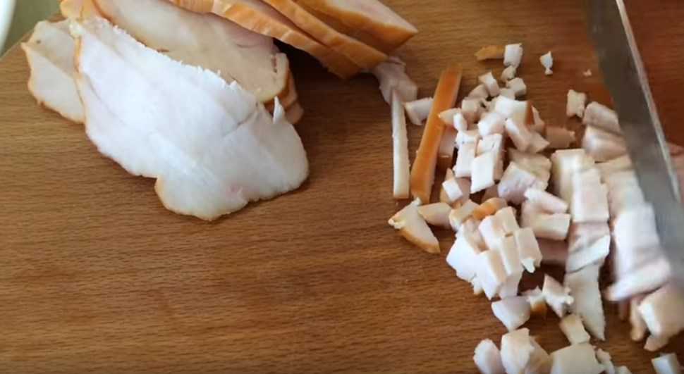 1. Ножом нарежьте на маленькие небольшие кусочки копченую грудку курицы или филе.