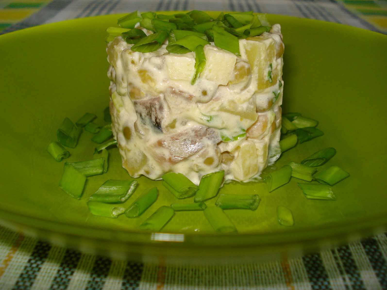 В заключении хочется дать некоторые советы по приготовлению салата. Лук надо мариновать в воде с уксусом не более двух минут или ошпаривать кипятком, чтобы из него ушла горечь. В блюдо можно добавлять отварной картофель, тогда оно станет более сытным.