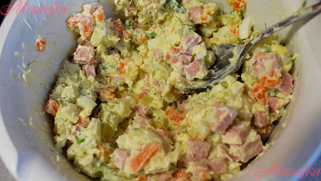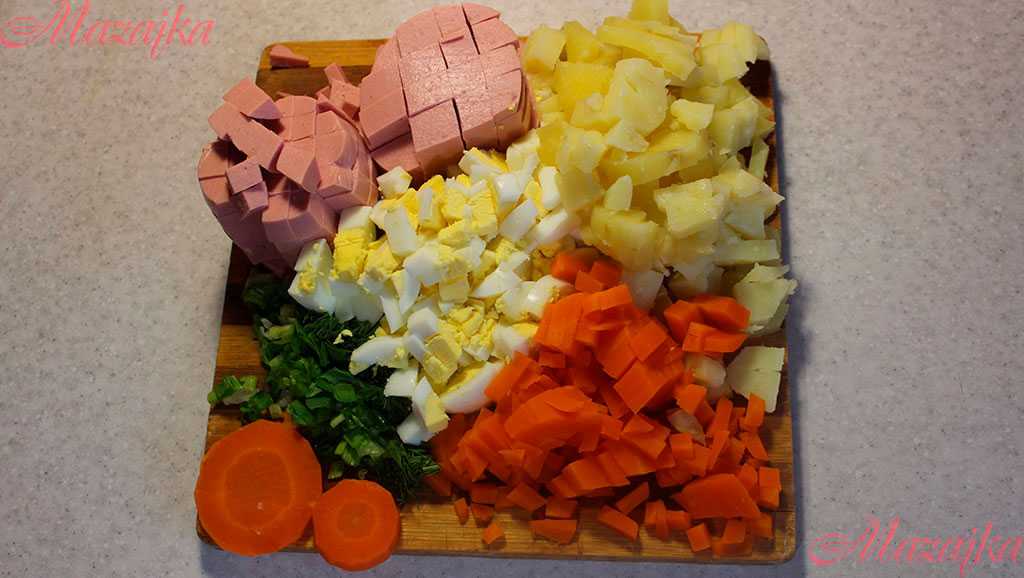 Ветчину, картофель, яйца и морковь нарежьте кубиками. Несколько кружочков моркови оставьте для украшения. Горох тоже оставьте для украшения.