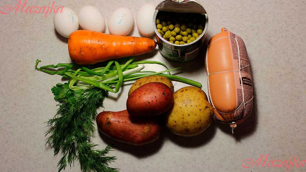Подготовьте все ингредиенты. Вымойте и очистите картофель и морковь. Взвесьте. В ингредиентах указан вес очищенных сырых овощей. Вскипятите воду и посолите. Отварите картофель и морковь целиком до готовности. Варите под крышкой на среднем огне. На это потребуется примерно 25 минут. Обязательно проверьте готовность, проткнув овощи вилкой. Если мягкие – сливайте воду и остужайте на блюдечке. Горох сразу откиньте на сито, чтобы жидкость стекла. Яйца положите в кастрюлю, залейте холодной водой. Если не всплывают – есть их можно, они свежие. Варите яйца после закипания в течение 10 минут. Затем залейте ледяной водой и сразу же очистите.