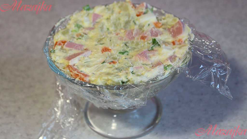 - Последний слой — измельченные ножом или на терке яйца. Плюс майонез.