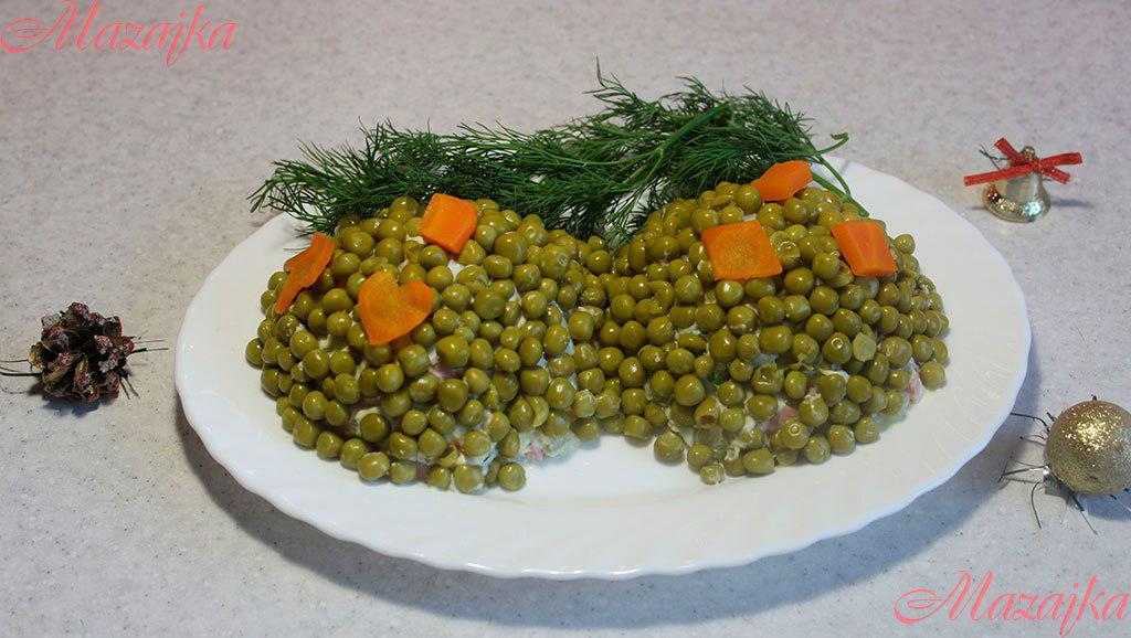 Переложите салат на плоское блюдо. Можно сделать не один, а несколько шаров. Смотрите по количеству салата. Выложите зелёный горох, полностью украсив ёлочную игрушку.