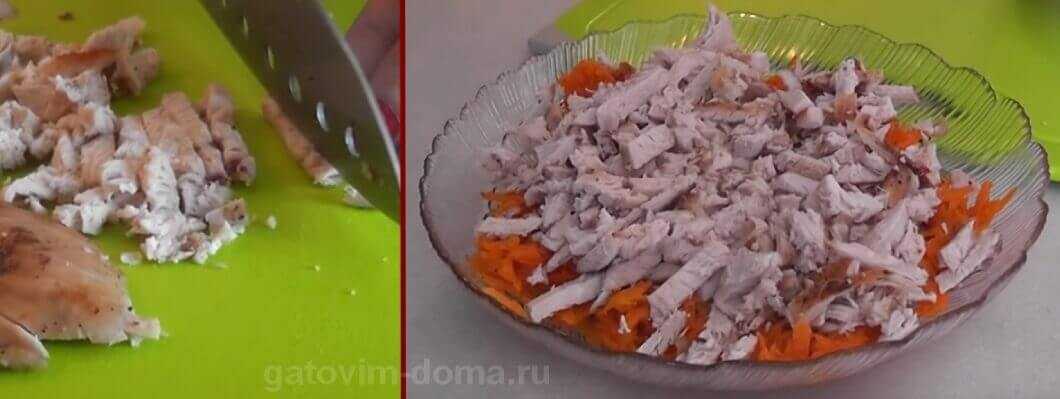 Далее остывшую курицу нарезаем тонкой соломкой и перекладываем к нашему салату.