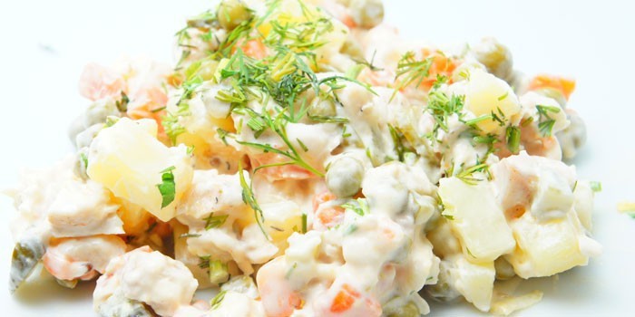 Салат Оливье с куриной грудкой и грибами