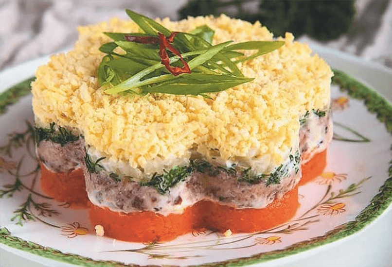 Все слои необходимо перемазать майонезом, салат поперчить и посолить. Блюдо украсить зеленью и яичным желтком.