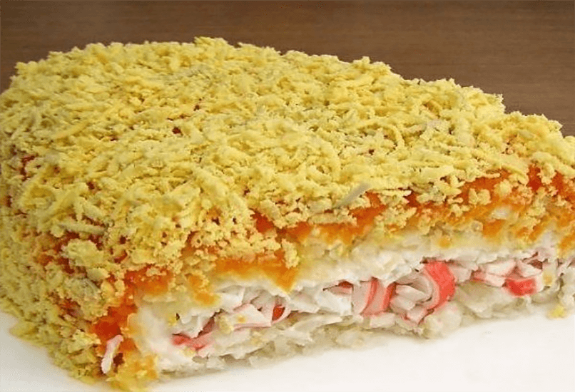 Этот салат тоже является слоёным и, как можно догадаться по подбору ингредиентов, очень похож на закуску, приготовленную по классическому рецепту салата из печени трески а-ля Мимоза.