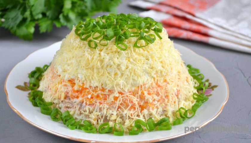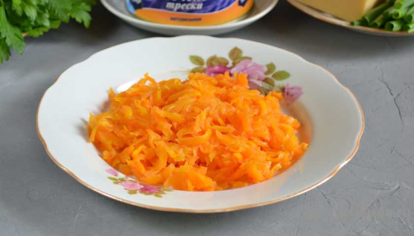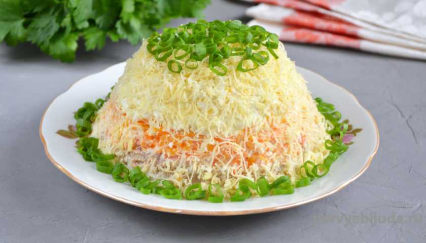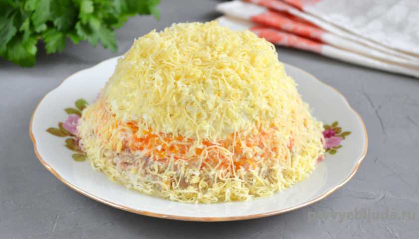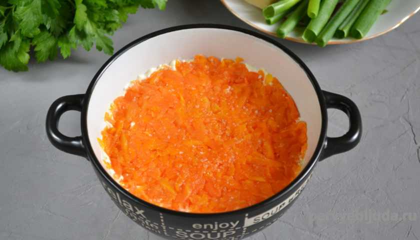 7. Крупно натертую морковку, как и яйца, делим пополам, добавляем в 2 слоя, солим и смазываем майонезом. При формировании слоев хорошо утрамбовываем ингредиенты, чтобы салатик не получился рыхлым.