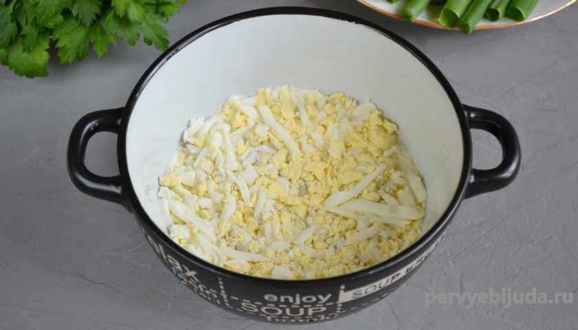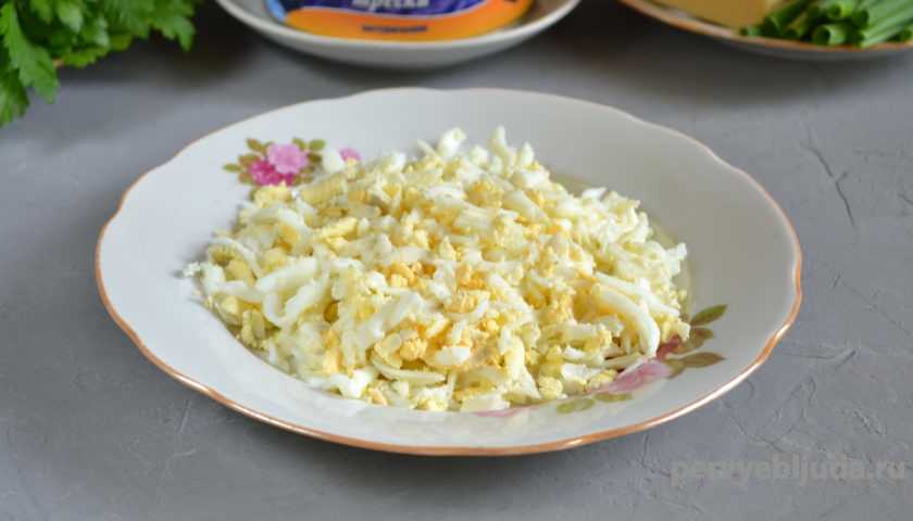 4. Яйца отварите, остудите и очистите. Два желтка оставьте для украшения, а остальные яйца крупно натрите.