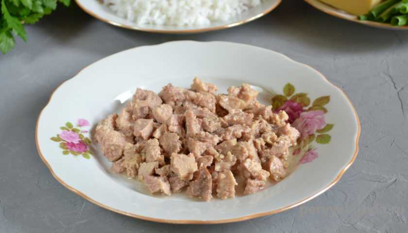 - Сливаем жидкость из банки с печенью трески. Нарезаем ее крупными кусочками.