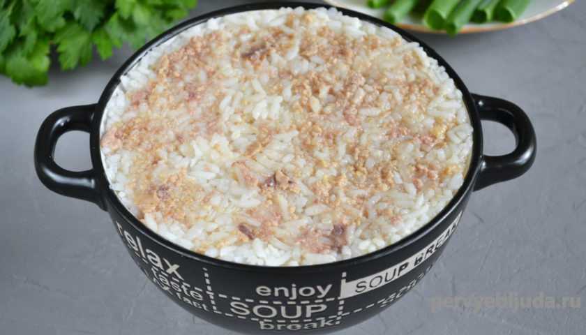 9. Вареный рис добавляем на печень, хорошо прижимаем, немного солим и поливаем маслом со дна банки, в которой находилась печень. Так, рис пропитается ароматами печени трески и слой получится очень сочным. Миску с салатом накрываем тарелкой или пищевой пленкой и охлаждаем минимум 1 час.