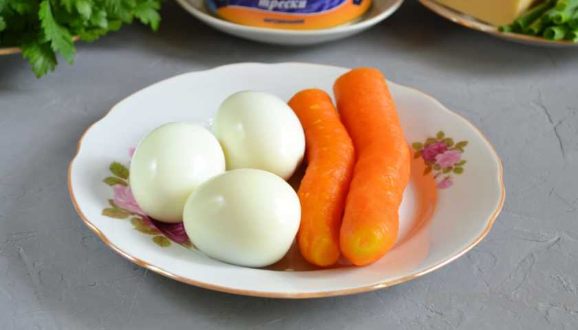 1. Морковь промываем и варим в воде до готовности 15-25 минут. Куриные яйца варим в воде после закипания 6-7 минут. Все заливаем ледяной водой и быстро остужаем. Очищаем.
