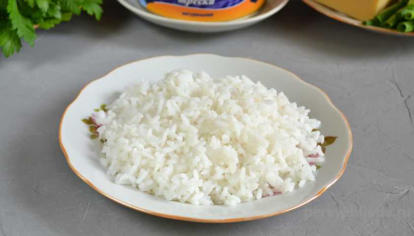 - Тщательно промываем рис и варим в подсоленной воде (примерно 20 минут). Лишнюю жидкость сливаем и оставляем рис остывать.