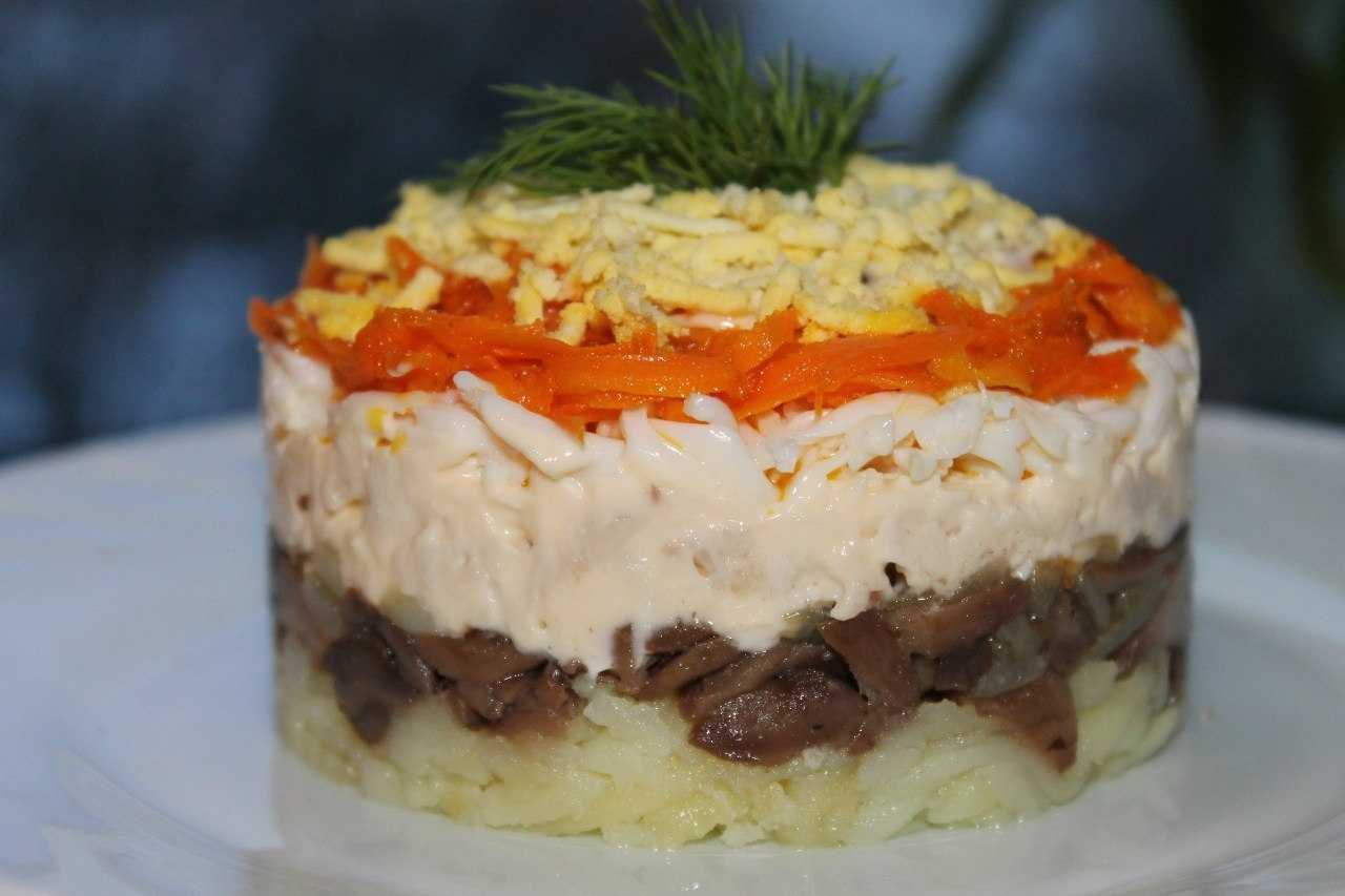 Отметим также, что данный салат имеет несколько вариантов — например, вместо корейской морковки в него можно положить морковь вареную, малосольную селедку заменить на отварную курицу, а тушеные с луком шампиньоны — на маринованные грибы.