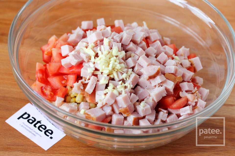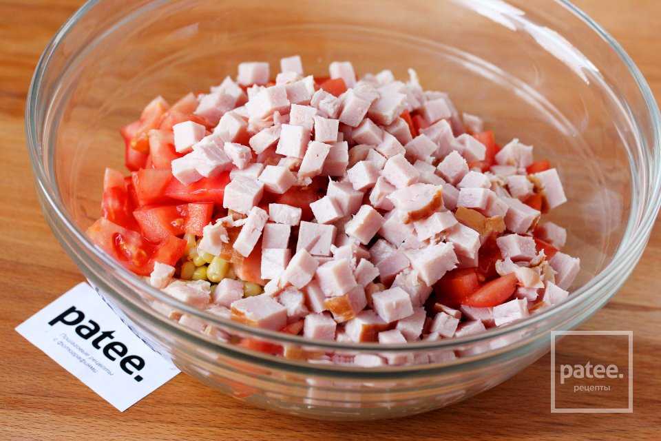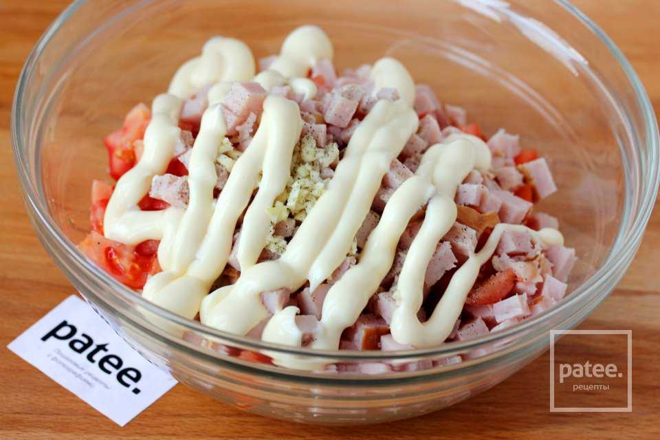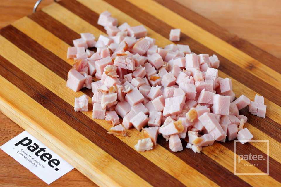 - В это время нарезать соломкой ветчину. Добавить две ложки майонеза, размешать и выложить первым слоем в салатник или кольцо.