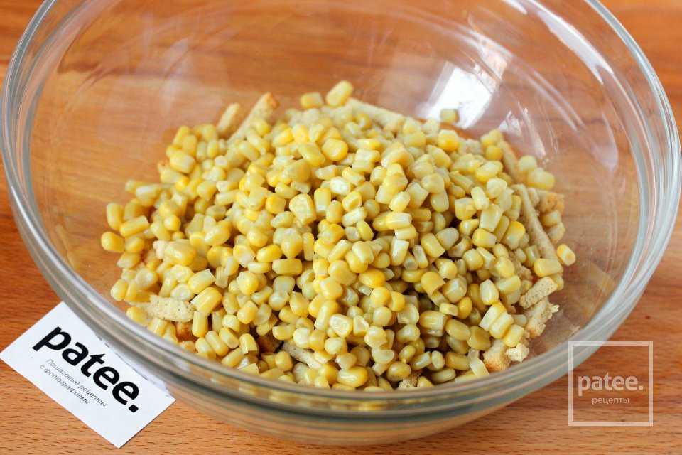 Банку с кукурузой открыть, слить жидкость, кукурузу смешать с предыдущими компонентами салата. Заправить салат майонезом и тщательно перемешать. Сухарики в салат необходимо добавлять непосредственно перед подачей на стол, чтобы они не размокли.