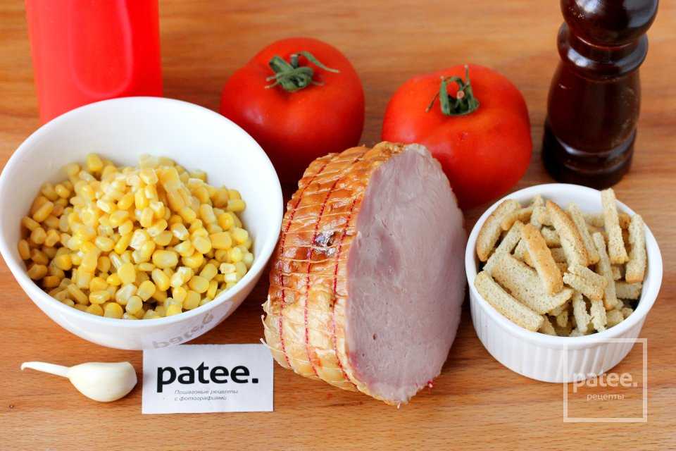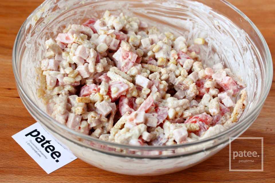 Сразу же подавайте вкусный салат с сухариками, помидорами, ветчиной и кукурузой к столу, пока сухарики не размокли!