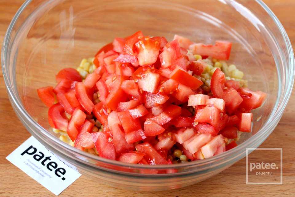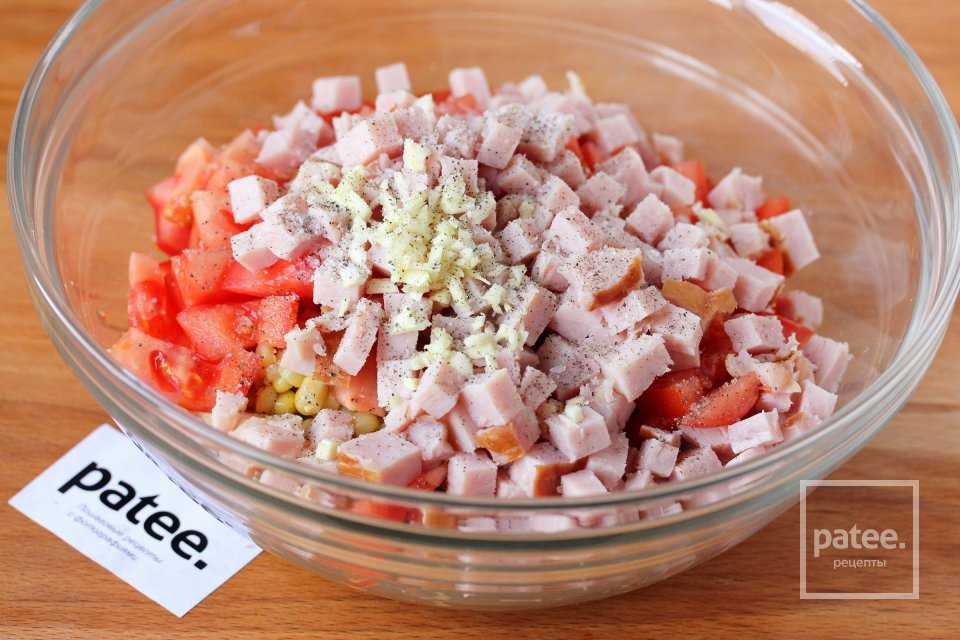 - С фасоли и кукурузы слить жидкость. Отправить в общую массу.