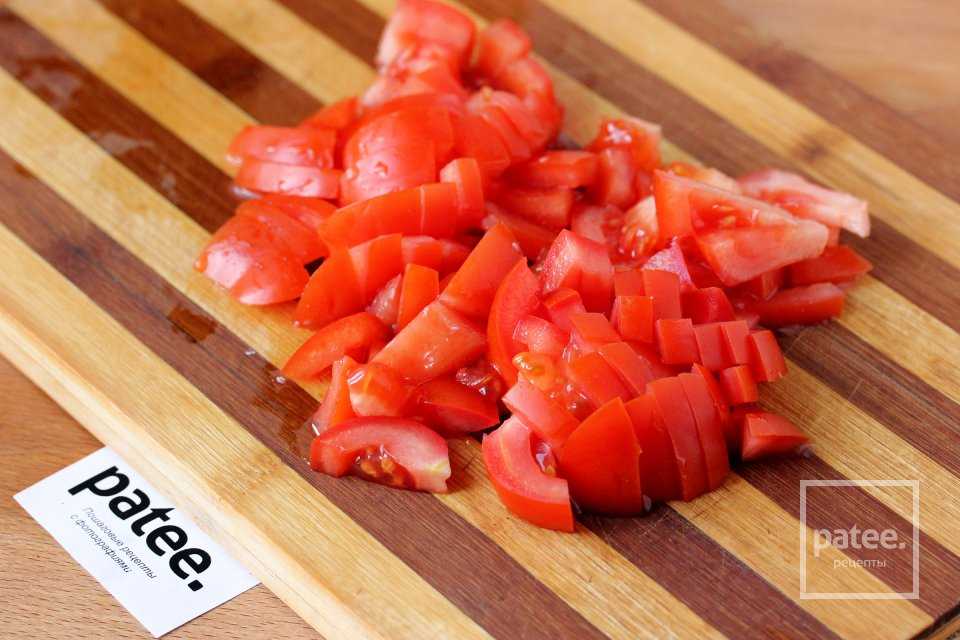 Крупные помидоры с плотной мякотью промываем, удаляем хвостики и вырезаем плодоножки. Нарезаем помидоры кубиками. Выделяющийся при этом сок сливаем!