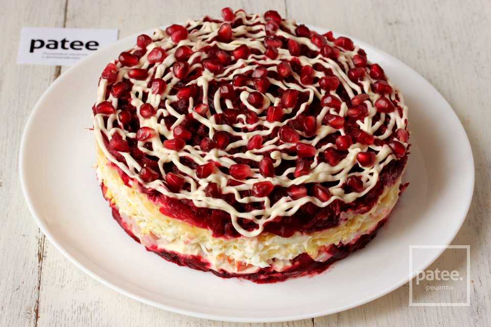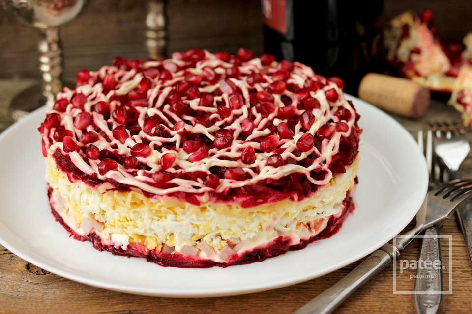 Украшенный салат оставьте минут на 20, чтобы он хорошенечко пропитался. В это же время его можно подержать в холодильнике для того, чтобы он немного охладился. В прохладном состоянии его вкус будет ощущаться еще больше. Затем подавайте блюдо к праздничному столу или на обычный ужин!
