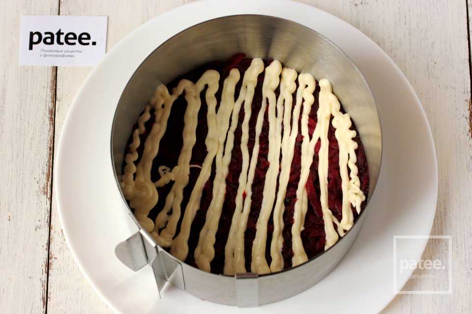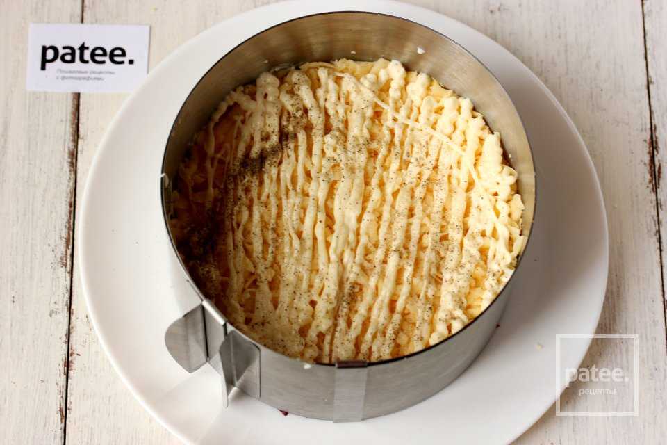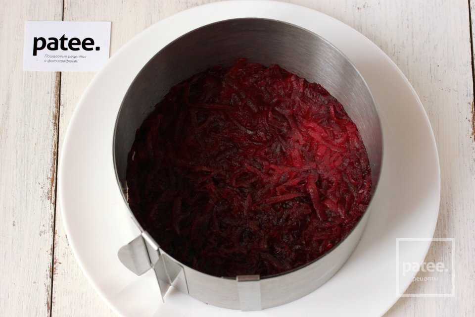 На дно плоской тарелки устанавливаем формовочное кольцо диаметром 16 см. Первым слоем выкладываем натёртую на крупной тёрке свёклу (половину указанного в ингредиентах количества, то есть 150 грамм).