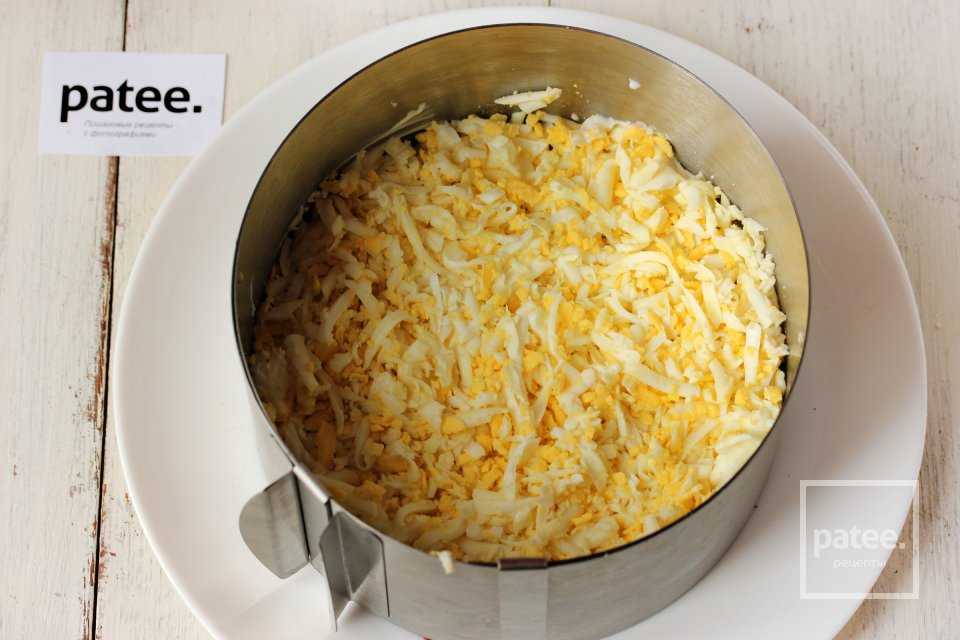 Далее следует слой из натертых на крупной тёрке куриных яиц.