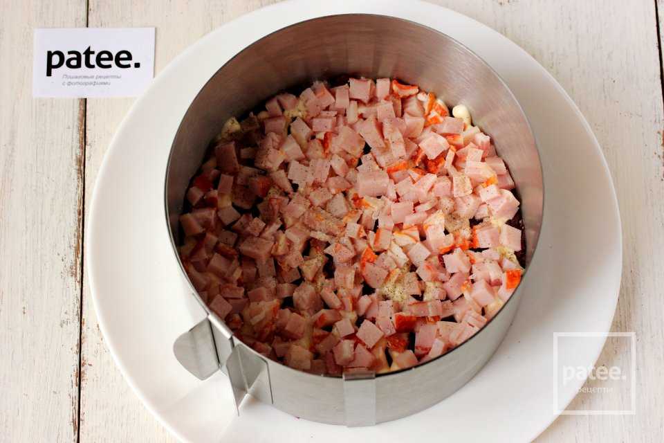 Следующим слоем выкладываем нарезанную мелкими кубиками ветчину.