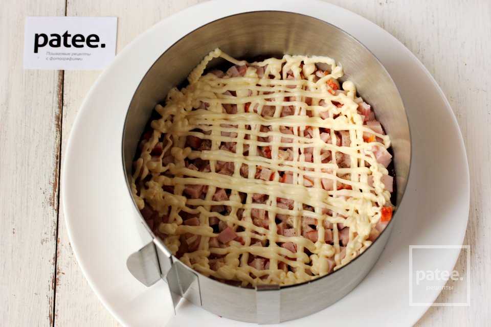 Слой из ветчины также поливаем майонезом и посыпаем небольшим количеством соли.