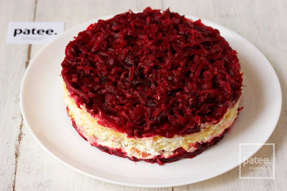 Последним слоем выкладываем натёртую на крупной тёрке оставшуюся свёклу. Ставим салат в холодильник пропитываться на 1-2 часа.