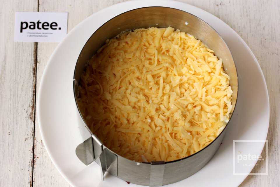 После следует слой из натёртого на крупной тёрке твёрдого сыра.