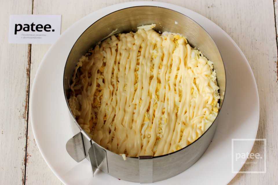 Яичный слой, как и предыдующие, поливаем майонезом.