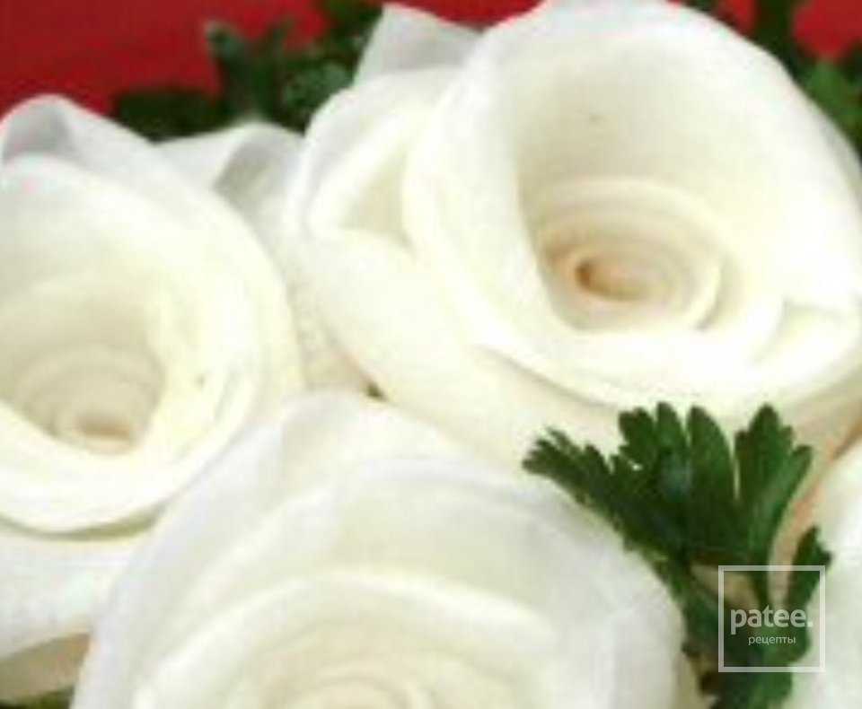 1. Белую редьку вымойте, очистите от кожуры.2. Овощерезкой нарежьте длинные полосы шириной около 2-3 сантиметров (старайтесь не нажимать на овощерезку слишком сильно, так как нам необходимы тонкие эластичные полосы, которые будут хорошо заворачиваться). 3. Сформируйте средину бутона: выберите небольшую полоску, скрутите ее трубочкой.4. Приложите к средине следующую полоску, сделайте петлю. 5. Конец полоски приложите к средине. Первый лепесток розы готов! 6. Аналогично сделайте необходимое количество лепестков. На фото – роза с тремя лепестками. 7. Чем больше будет лепестков, тем пышнее и роскошнее будет выглядеть ваша роза. Постарайтесь сделать цветок как минимум из 6-7 лепестков. 8. Крепко держа бутон в руке, закрепите лепестки зубочистками и отрежьте лишние кусочки полос снизу бутона.