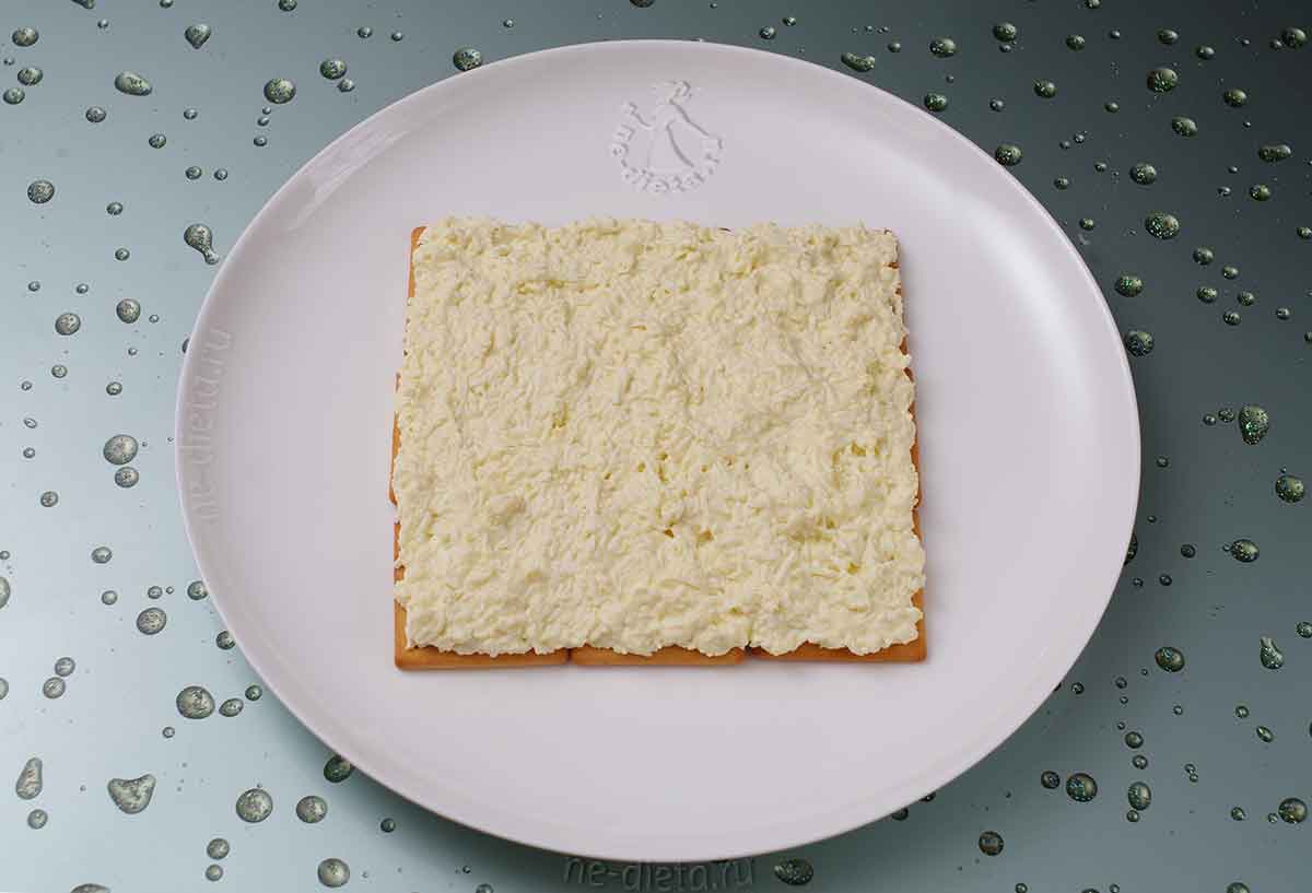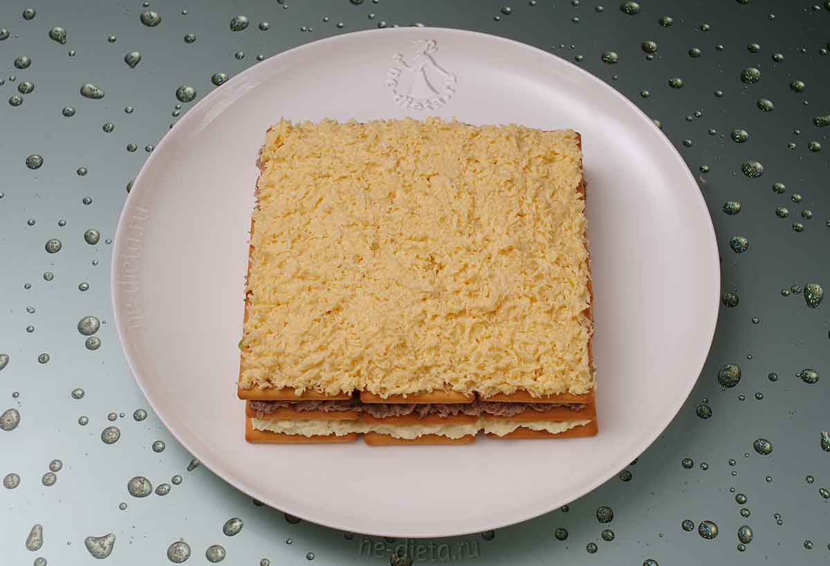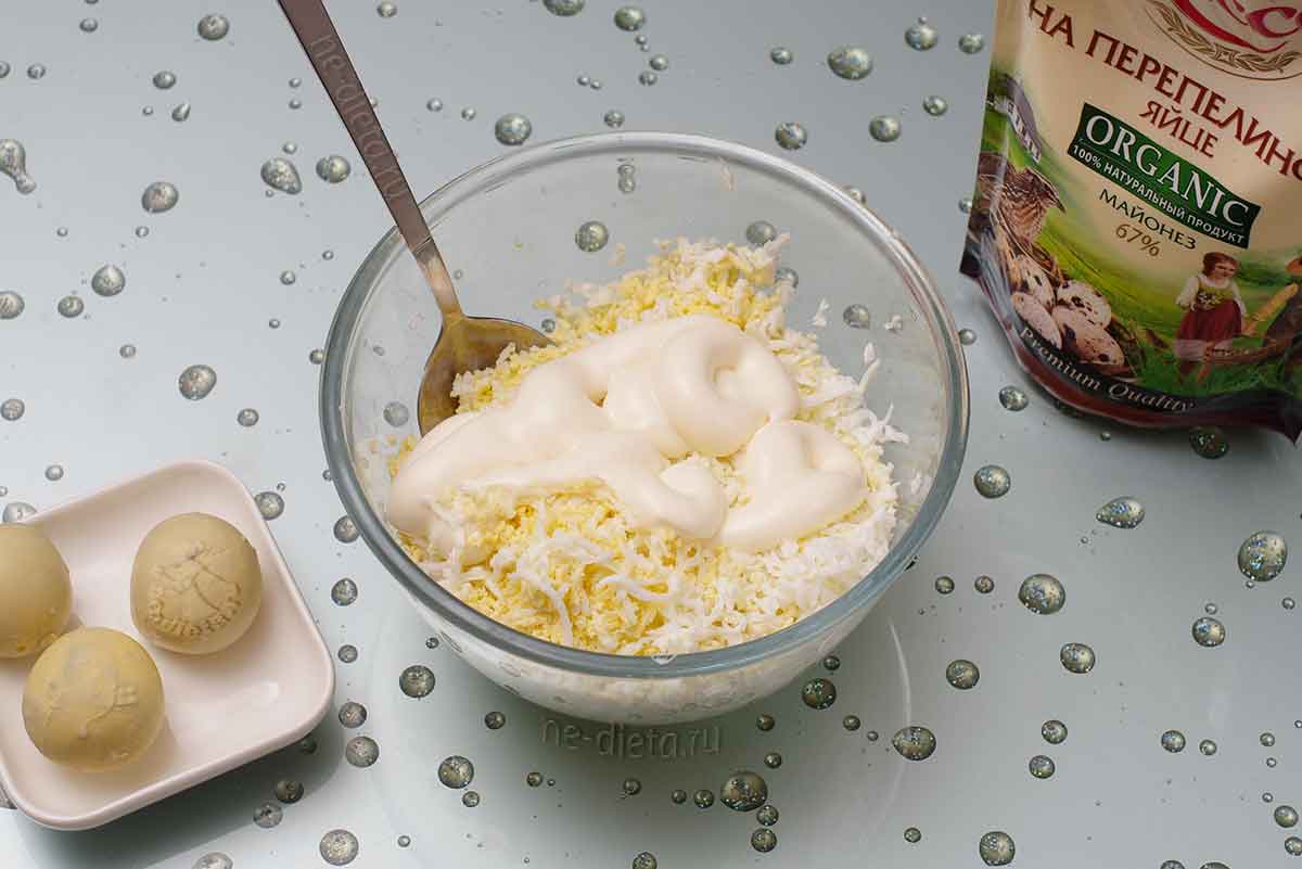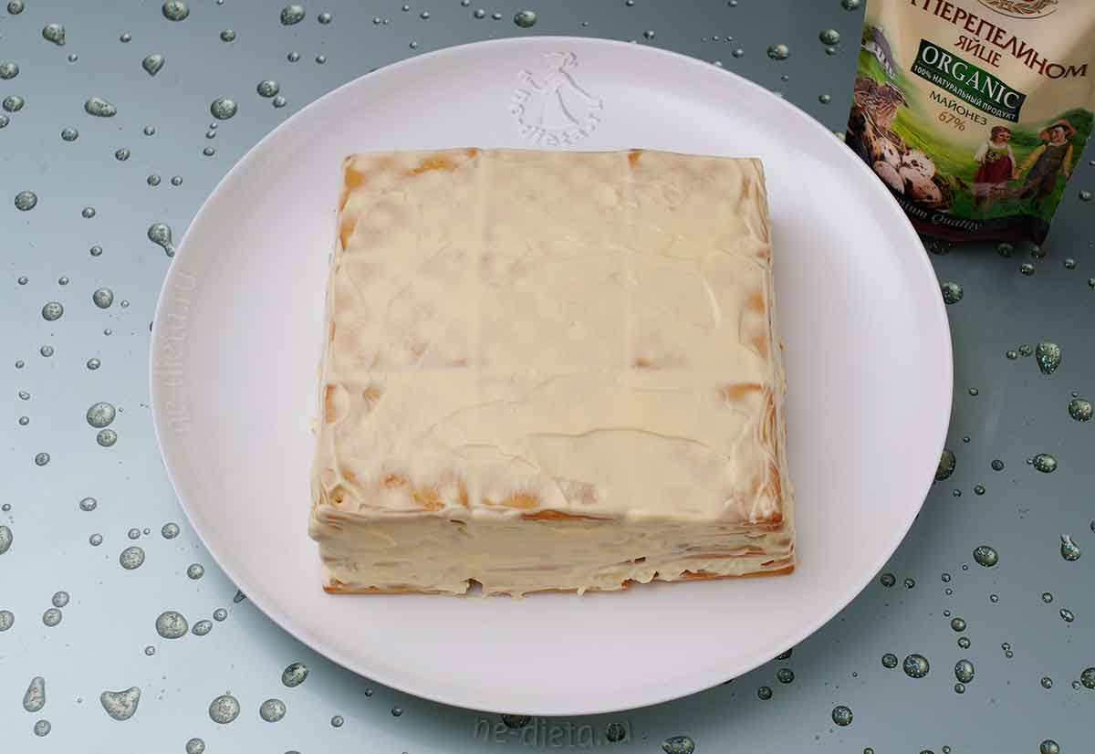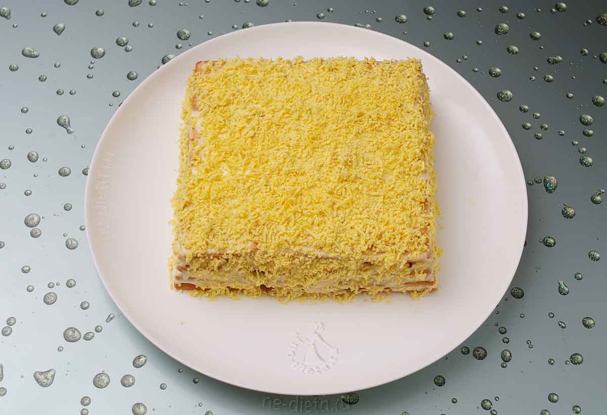 Пятый слой – сыр, который мы просто смазываем майонезом, и, наконец, шестой слой – это яйца.