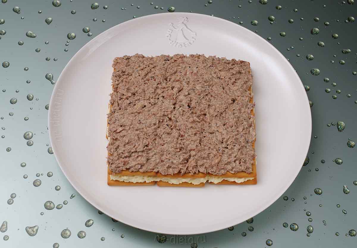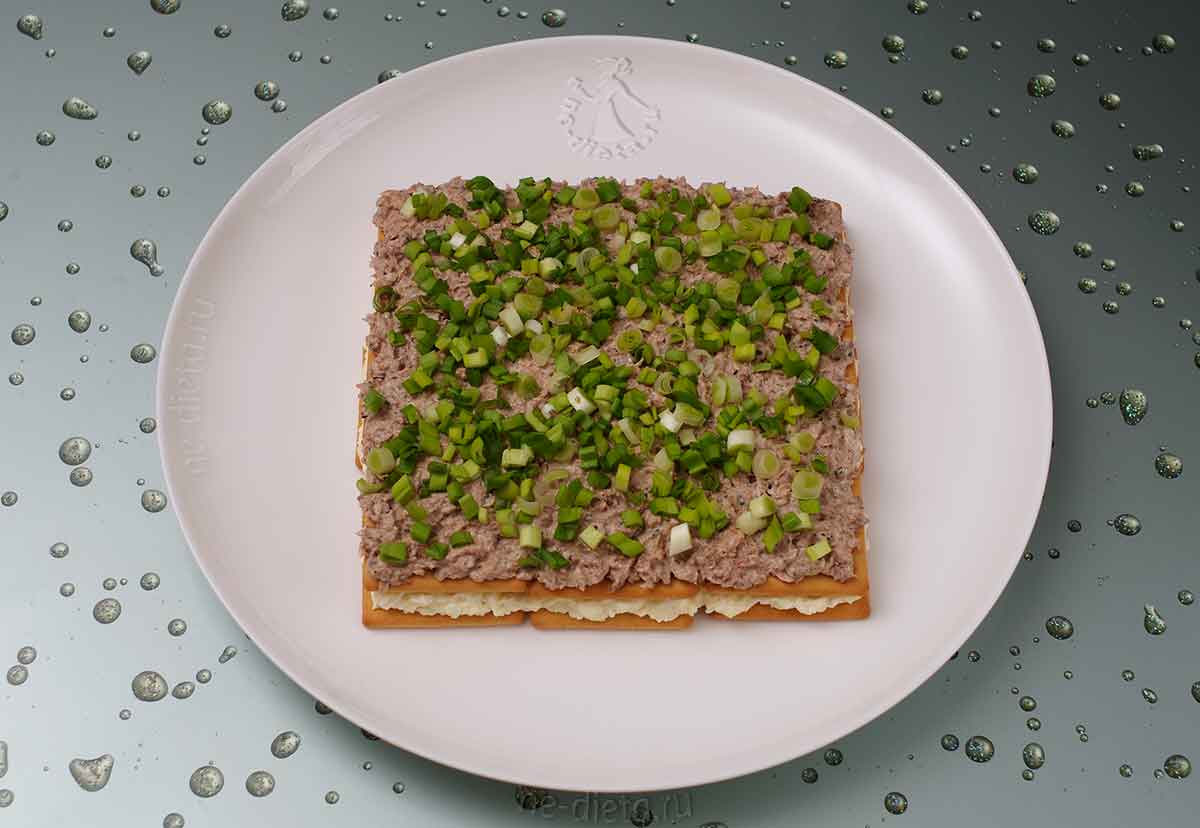 Второй слой — выкладываем лук, его ничем не смазываем, сверху тут же третьим слоем выкладываем шпроты, а уже их смазываем майонезом.