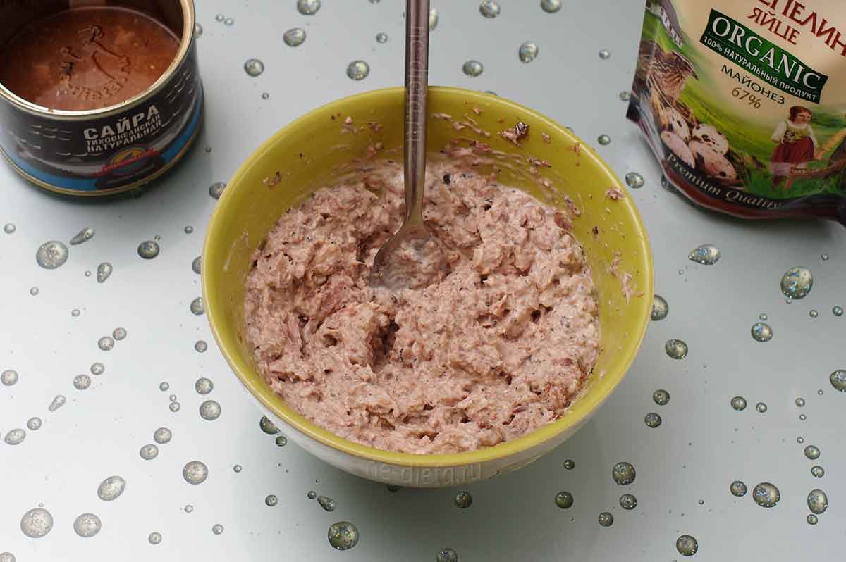 У рыбок отделить хвостики и на время отложить в сторону.Оставшиеся шпроты размять вилкой….