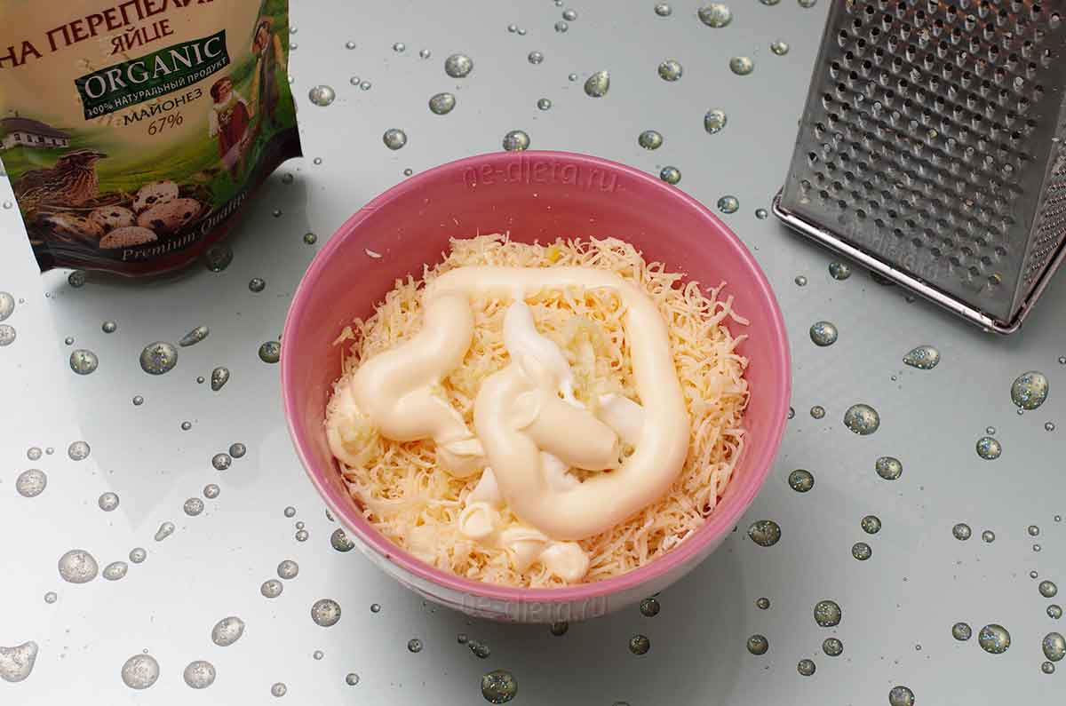 – — В салат можно добавить ещё и чеснок (это для любителей). Использовать его можно в слое с сыром.