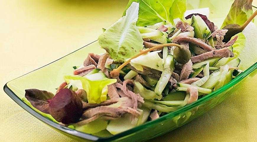 Дополнив салат с говяжьим языком свежим огурцом, в итоге получим сытную, легкую и полезную холодную закуску.