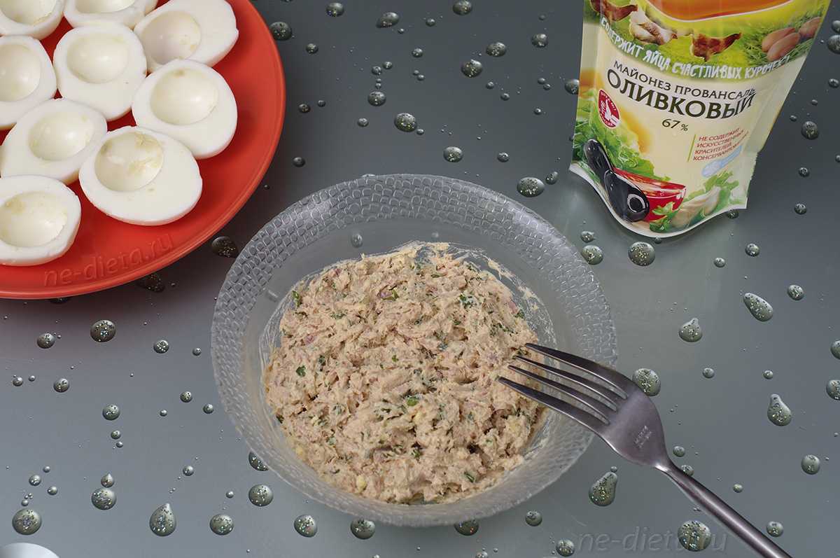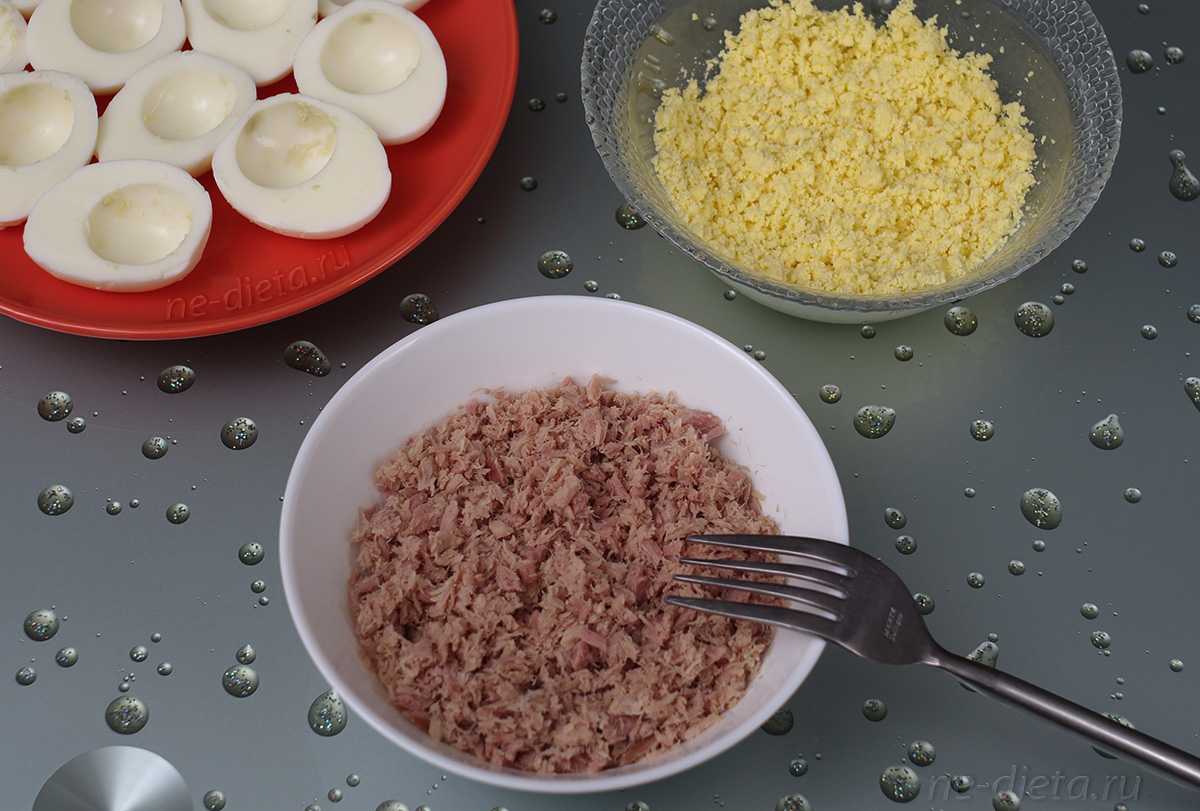 Совет! Для приготовления фаршированных яиц по этому оригинальному рецепту можно использовать абсолютно любые консервы из тунца, какие удастся купить в магазине. Следует иметь в виду, что тунец в масле будет иметь более сочную консистенцию и насыщенный вкус, тогда как рыба в собственном соку сделает закуску менее калорийной. Можно также приобрести рубленого тунца, предназначенного для приготовления салатов, что поможет сэкономить немного времени на его измельчении.