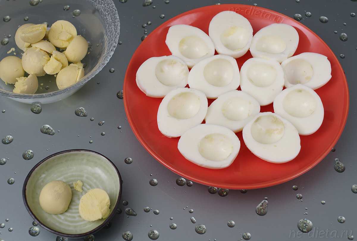 - Каждое яичко разрезается пополам вдоль, из него извлекаются желтки. Для большей устойчивости яиц можно срезать и выпуклую часть белка, но только так, чтобы в нем не образовалось отверстия.