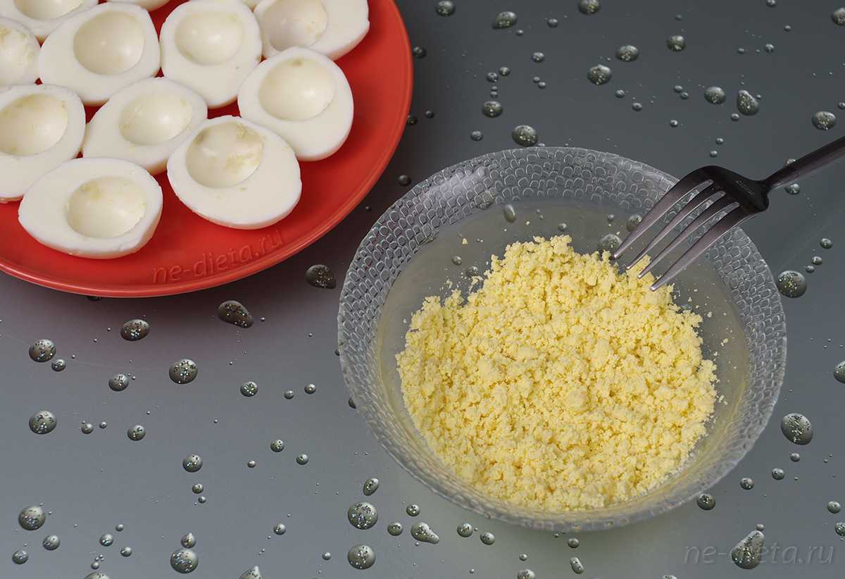 - Желтки разминают вилкой и соединяют с другими компонентами начинки, предварительно измельченными до состояния паштета, пасты или пюре.